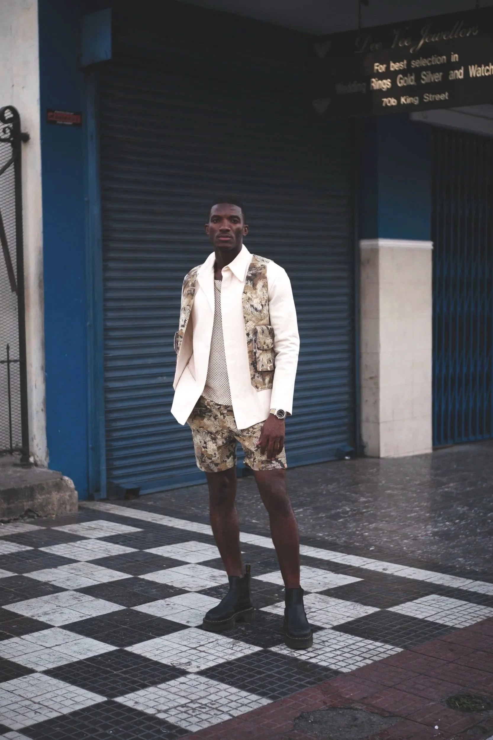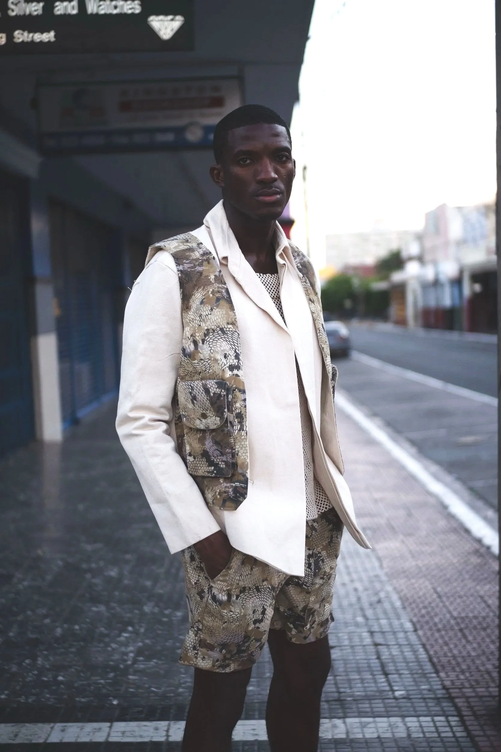 Crafted with high-quality fabric, this cropped utility jacket offers a unique blend of rugged and refined style. Featuring an off-white base with distressed brown and green streaks, the textured design adds a worn-in, artistic touch. The structured fit includes one functional flap pocket, snap button closures, and sleeve details that enhance its utilitarian aesthetic.